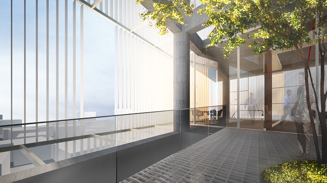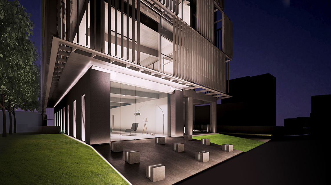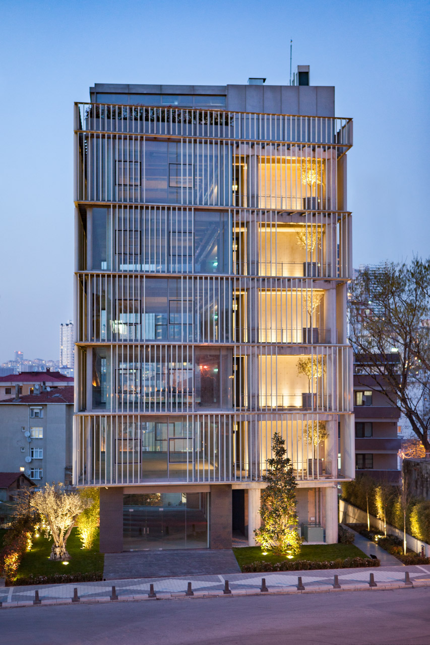 Bulunduğu fiziksel çevrenin en azından önümüzdeki on yıl boyunca inşa edilmeye devam edeceği gerçeğini sessizce kabul eden proje, bulunduğu fiziksel çevre ile arasına aldığı yarı geçirgen cephe sisteminin arkasında, olabildiğince çıplak bir yapı olarak kendisini var ediyor. Bu çıplaklık ya da açık seçiklik, sadece yapısal elemanlar için değil, aynı zamanda plan kurgusu için de anlamlı; zira plan şeması servis veren ve servis alan alanların birbirinden ayrıştığı net kullanım alanlarına ve tariflerine sahip bir iç düzenleme üzerine temelleniyor. Servis veren alanlar ile servis alan alanlar arasındaki geometri ve büyüklük farkı ise, ara alanların açık bahçeler halinde düzenlenmesine ve ikincil cephe sisteminin arkasında kurulan iç dünyanın “neşelenmesine” olanak sağlıyor.